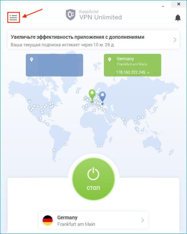 Чтобы перейти в Меню нашего VPN для Windows ПК, нажмите