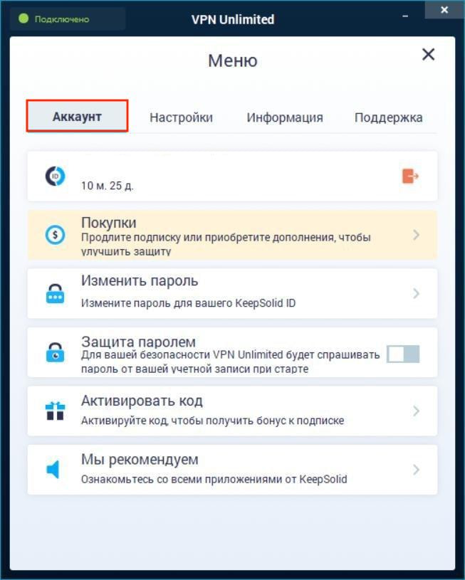 - Информация о вашем KeepSolid ID: адрес электронной почты, на которую зарегистрирована ваша учетная запись и оставшийся период вашей подписки.